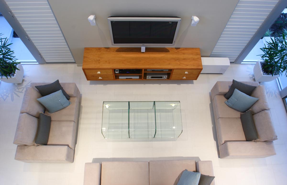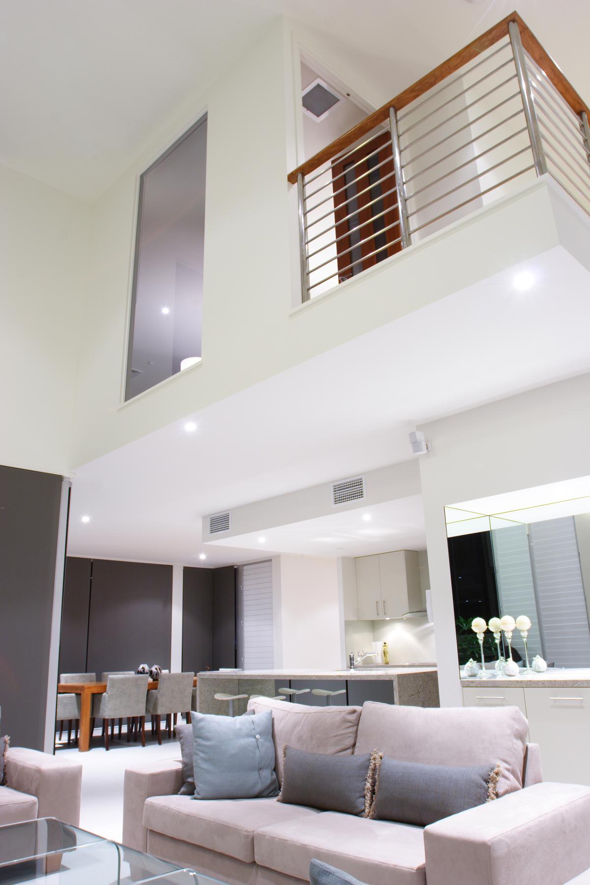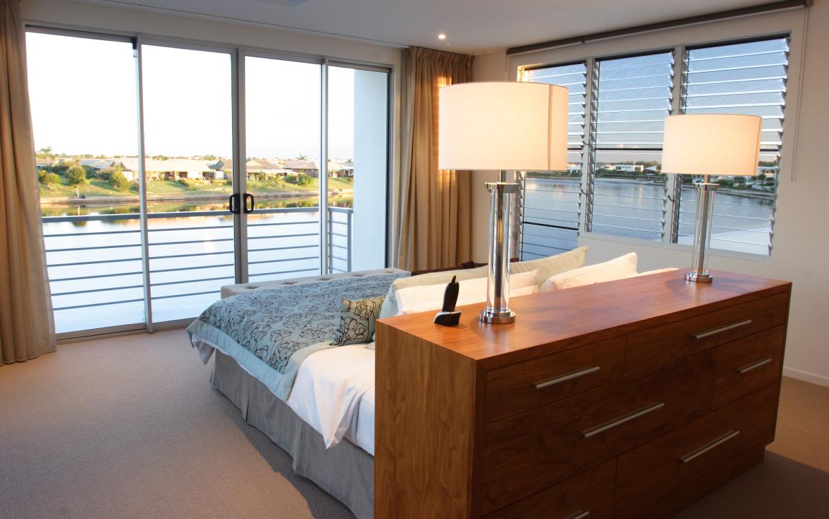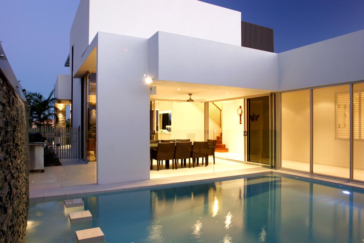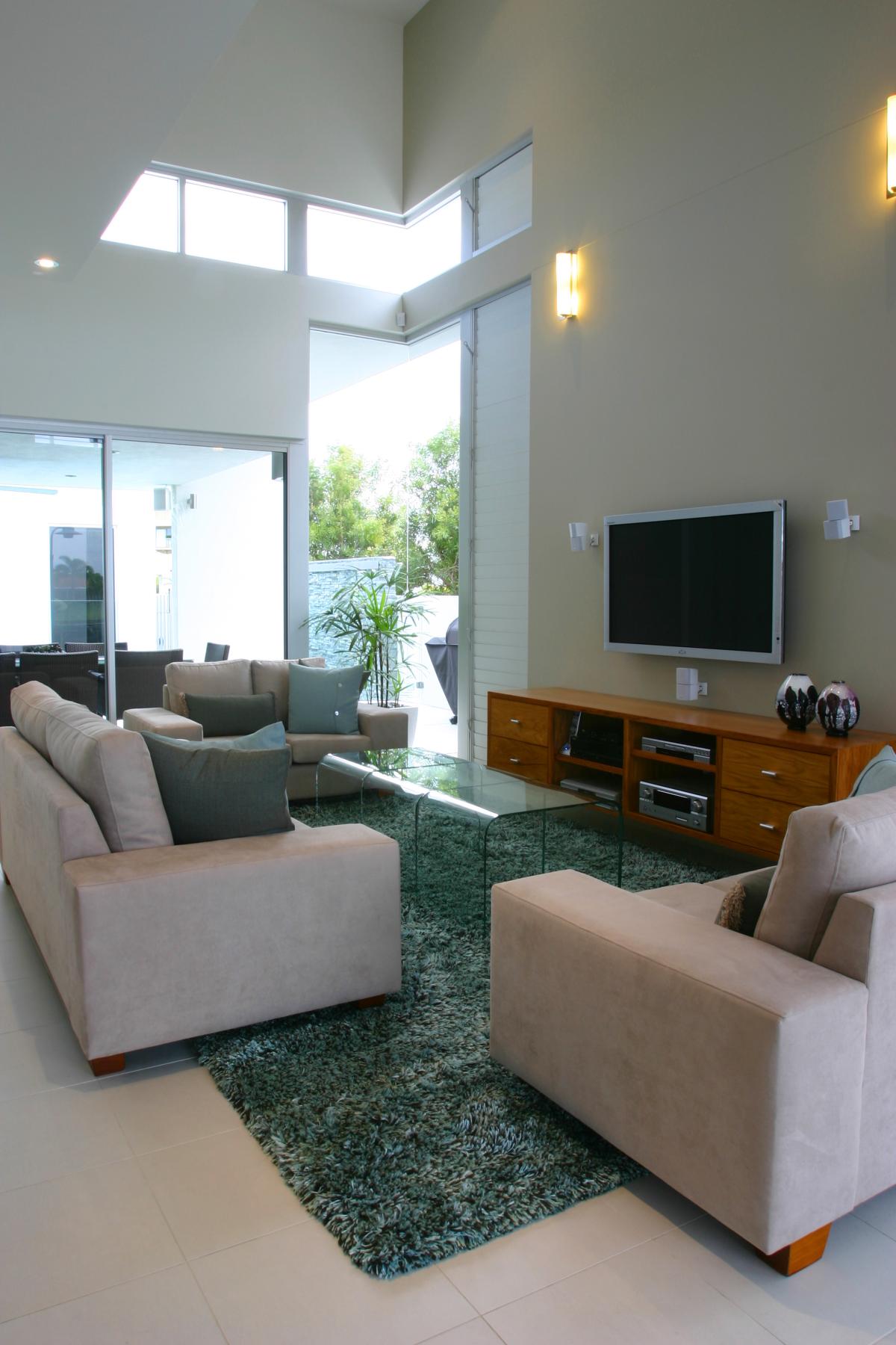 15 metre wide waterfront home designed for Ryan Designer Homes as a Spec home. This modern home captured the essence of good design with introducing the u shape plan, stone, timber, voids and achieving a three bedroom, study, two living areas and large master bedroom on a tight site.
