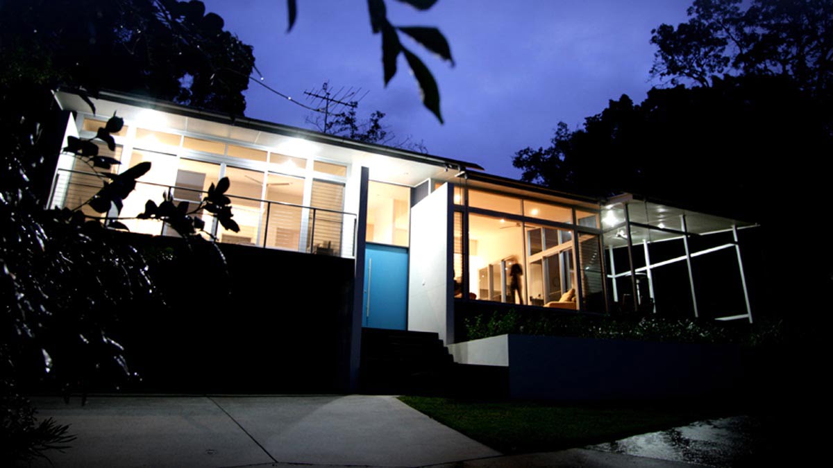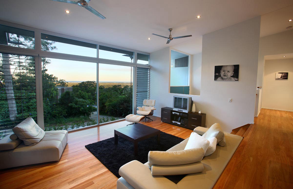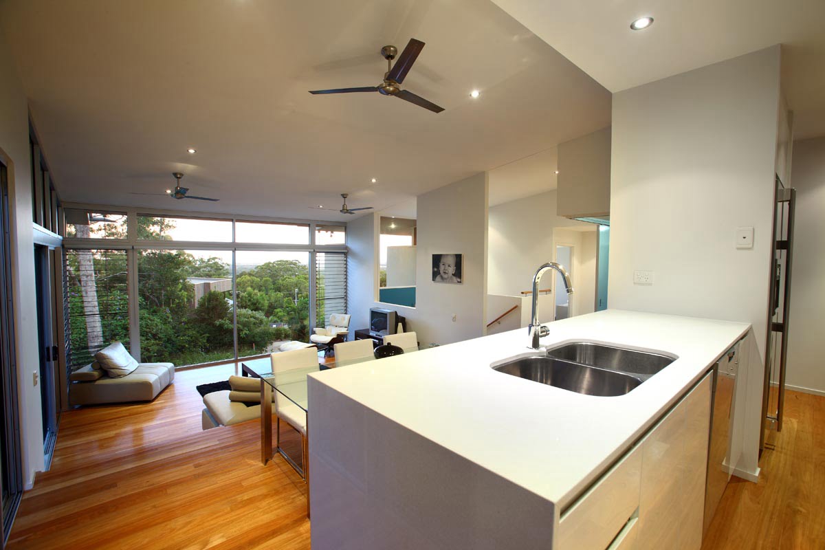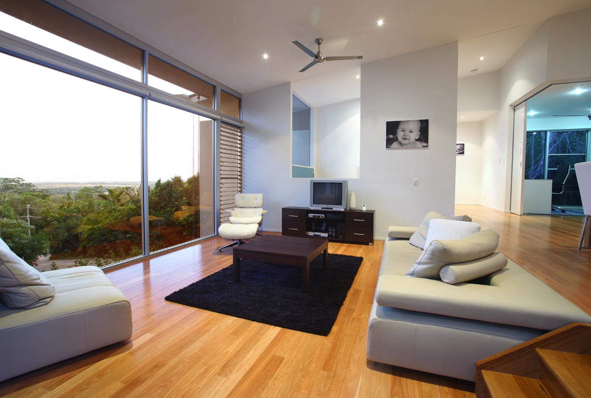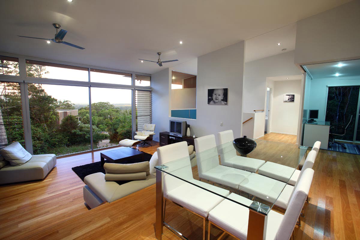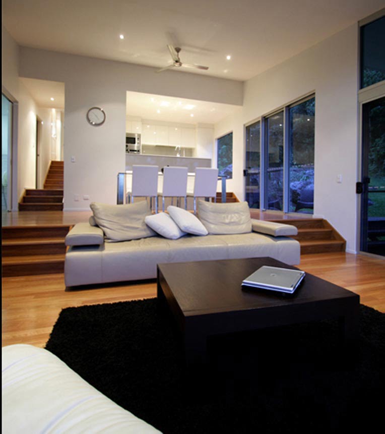 A split level layout pursues the natural contours of the land, allowing for the interior living room to be sunken, and the pool zone to walk out to flat land.